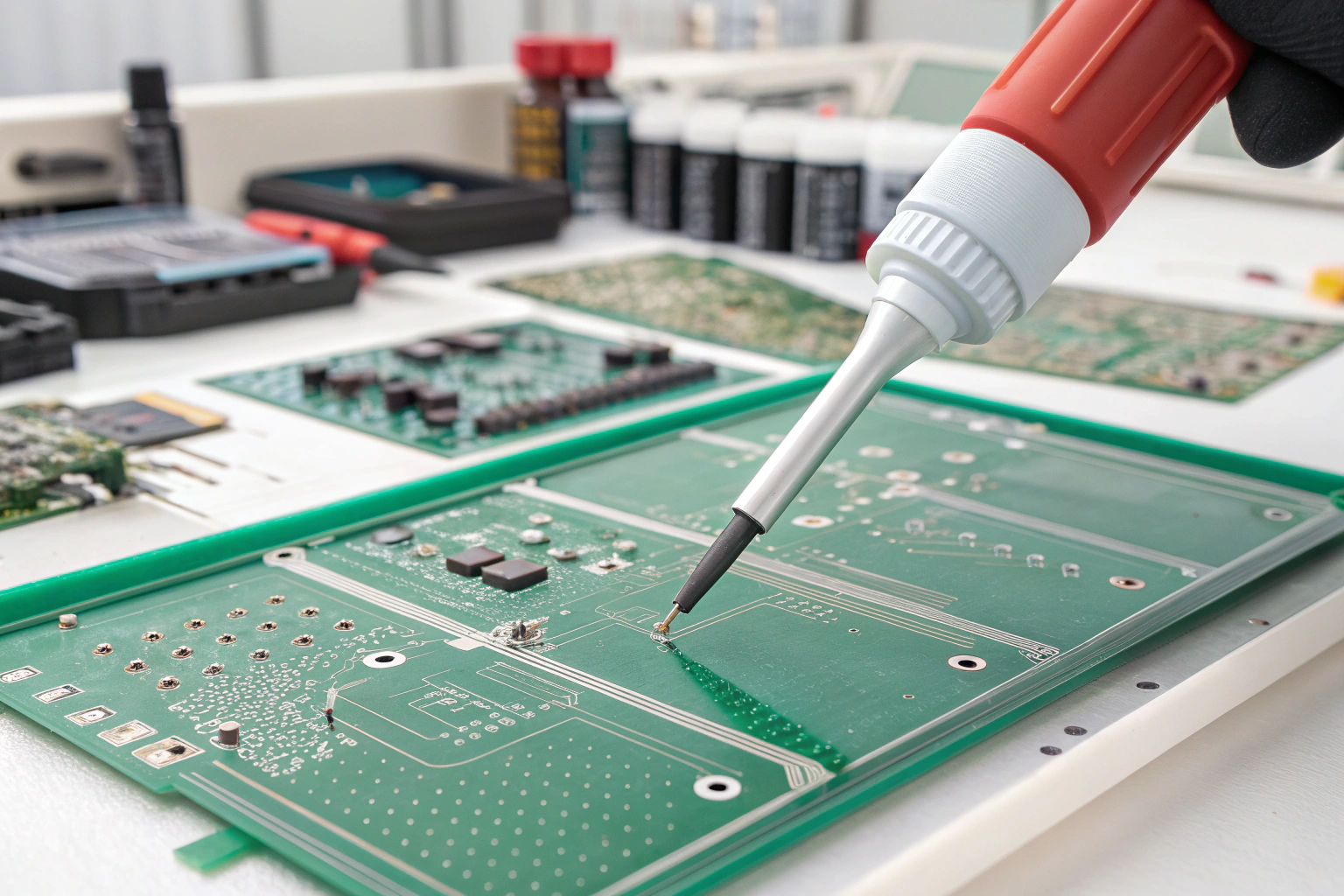 In dense PCBs, glue can migrate into connectors, test points, or fine-pitch areas. Once cured, removal often damages pads or traces.