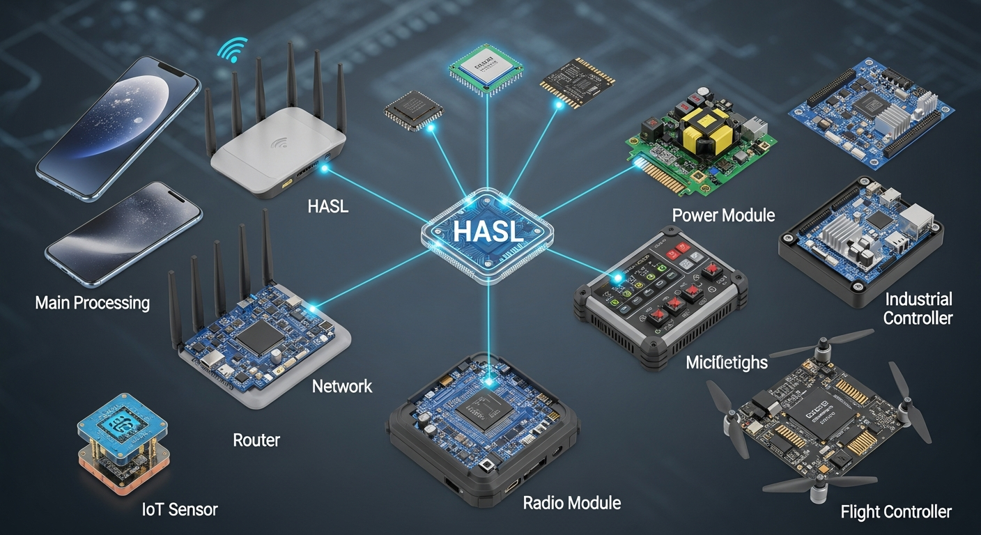 HASL is used in consumer electronics, power modules, industrial controllers, and IoT devices.