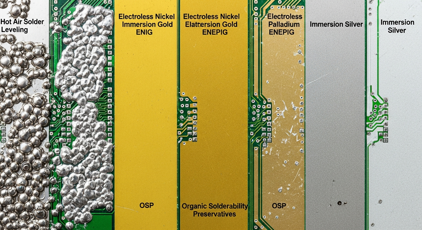 Common finishes include HASL, ENIG, ENEPIG, OSP, and immersion silver, each suited for different applications.