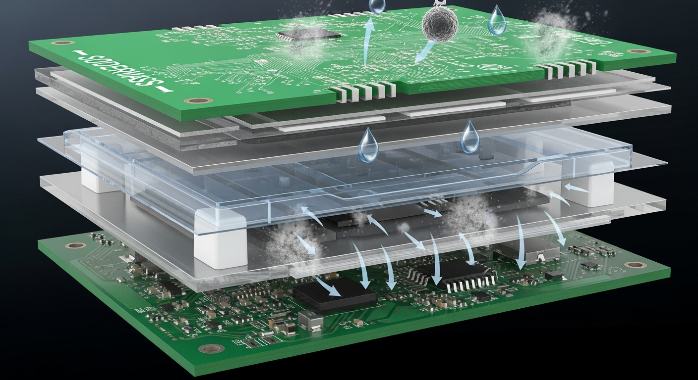 Protective layers include solder mask, conformal coating, and specialized encapsulation materials.