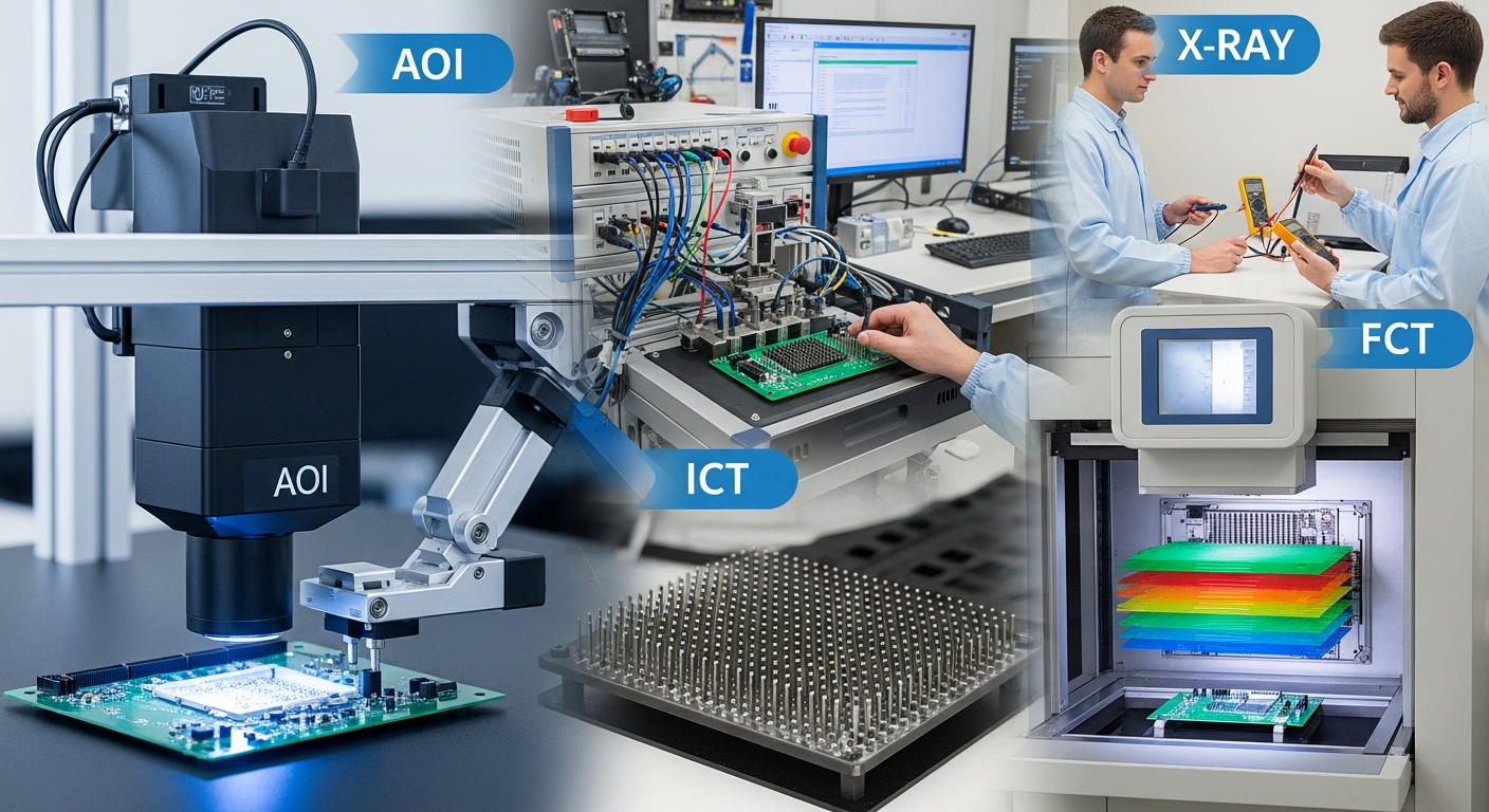 Common processes include AOI, X-ray, ICT, FCT, and final functional validation.