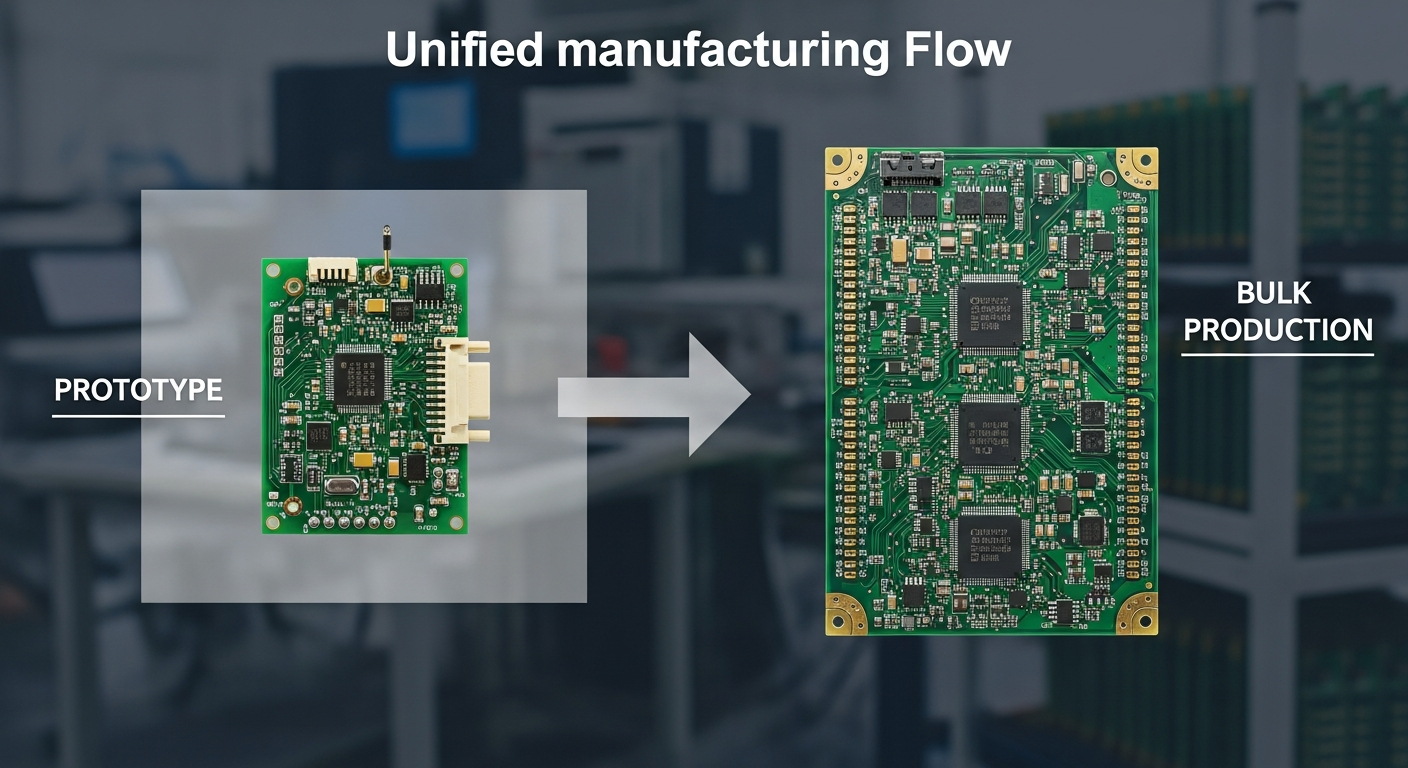 Using one fab house for both prototype and bulk production ensures consistent quality, reduced delays, and smoother scaling from early samples to volume manufacturing.