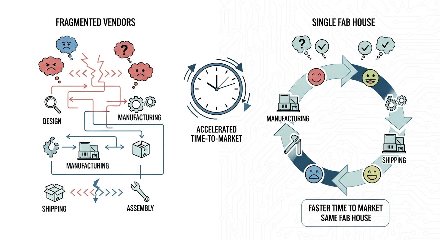 A single fab house reduces rework by maintaining stable manufacturing rules throughout development.