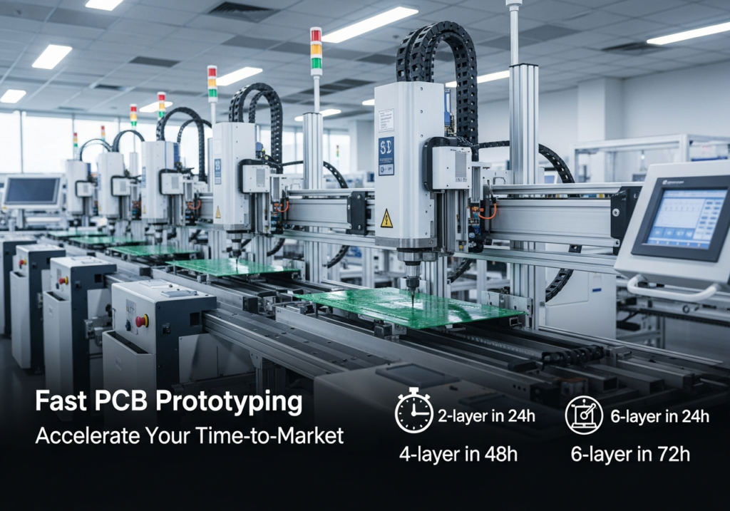 Our automated prototyping line features high-speed CNC drilling and precision PCB processing systems, optimized for fast-turn production. Operating in a clean, well-managed environment, we support rapid delivery for multilayer PCBs—2-layer in 24h, 4-layer in 48h, and 6-layer in 72h.