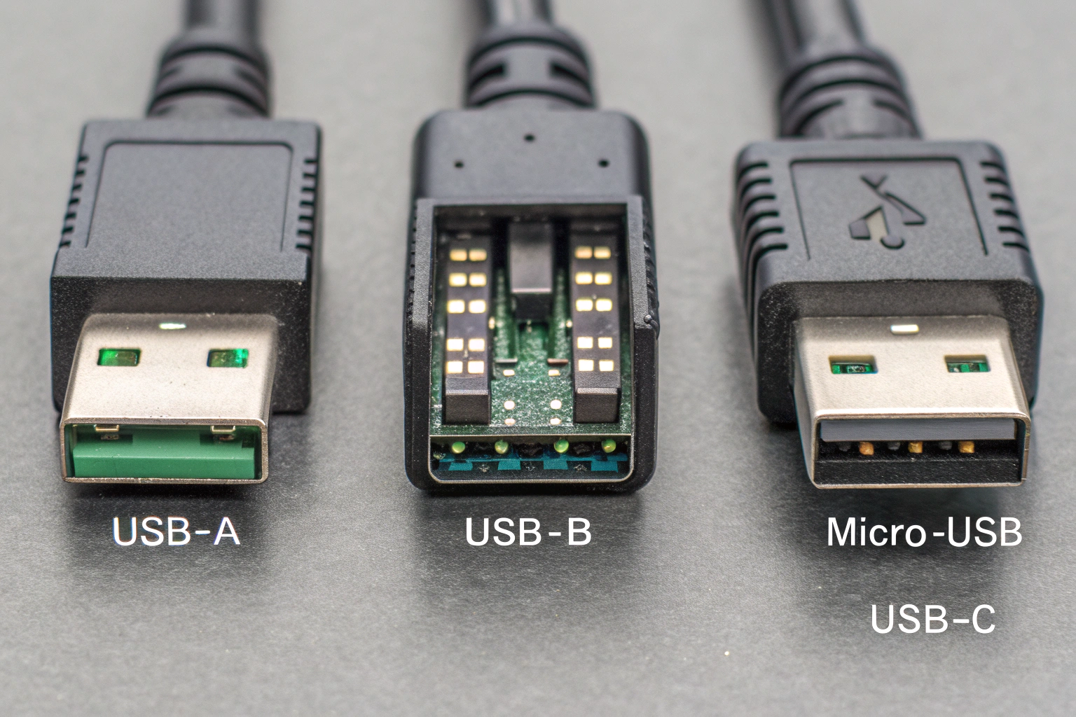 USB-A, USB-B, Micro-USB, and USB-C each have unique pinouts, but all include power, ground, and differential data pairs.
