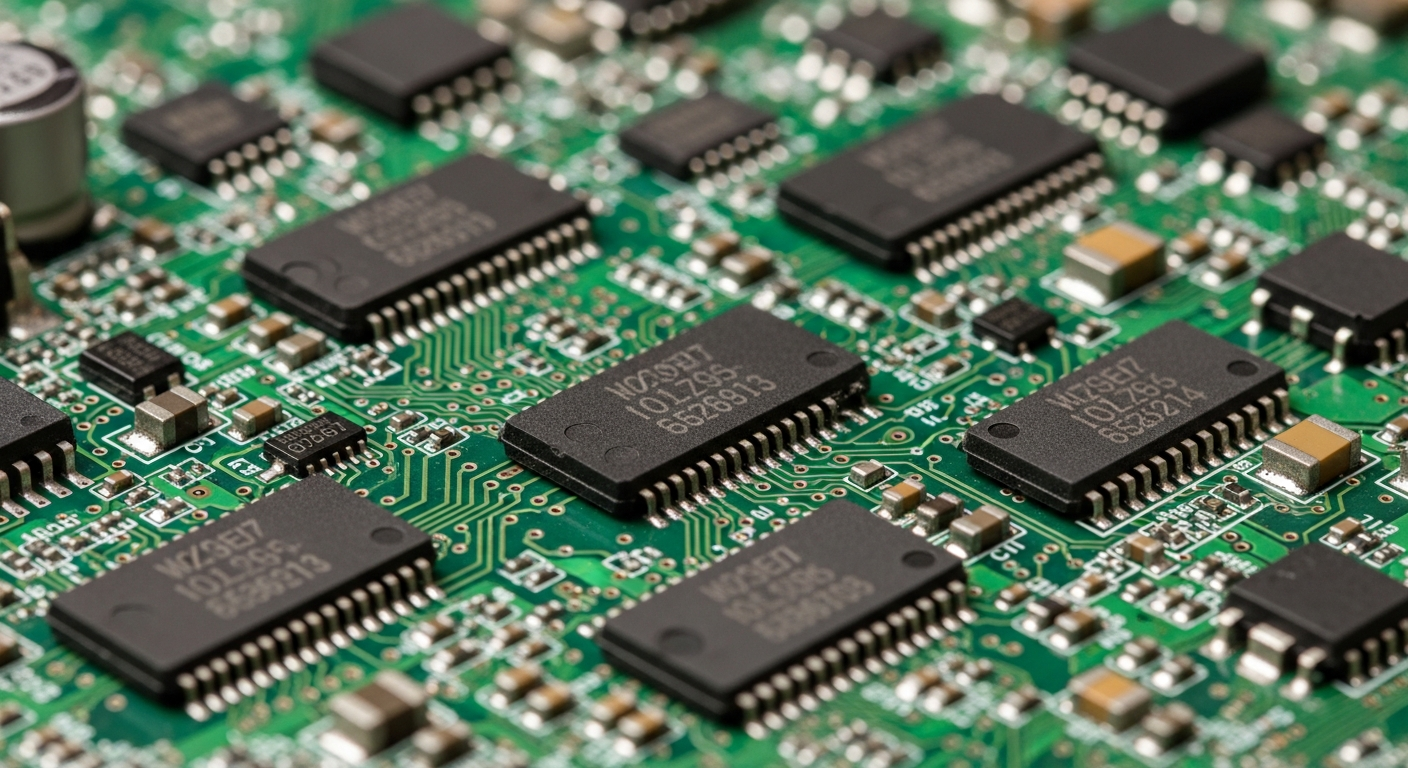 Typical IC board components include microcontrollers, memory chips, power ICs, RF modules, analog ICs, sensors, and supporting passive elements such as resistors and capacitors.